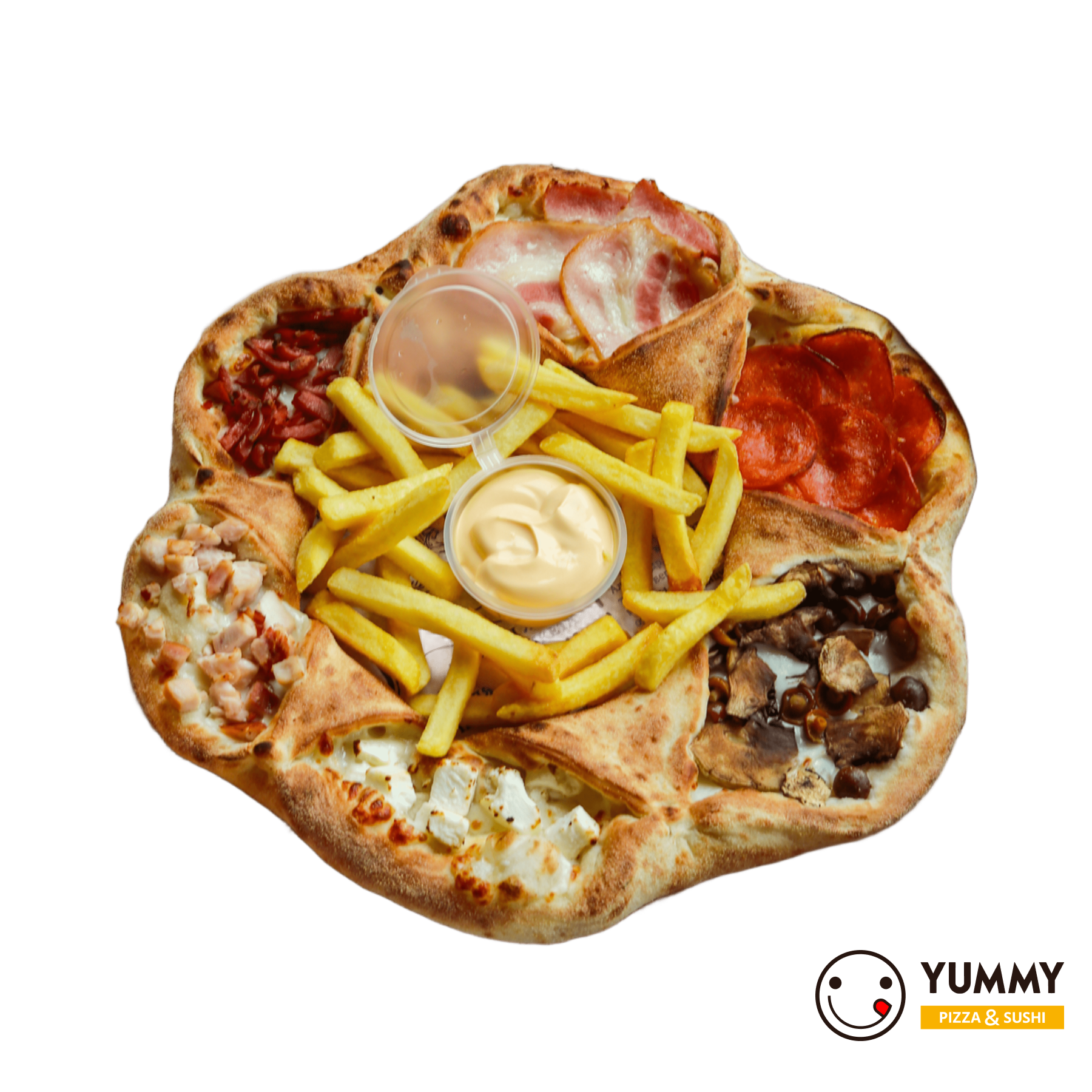 Пицца на тонком тесте делится на сектора и рассчитана для компании которая не может определится с выбором вкуса. Подается с соусом сырным и картофелем фри.