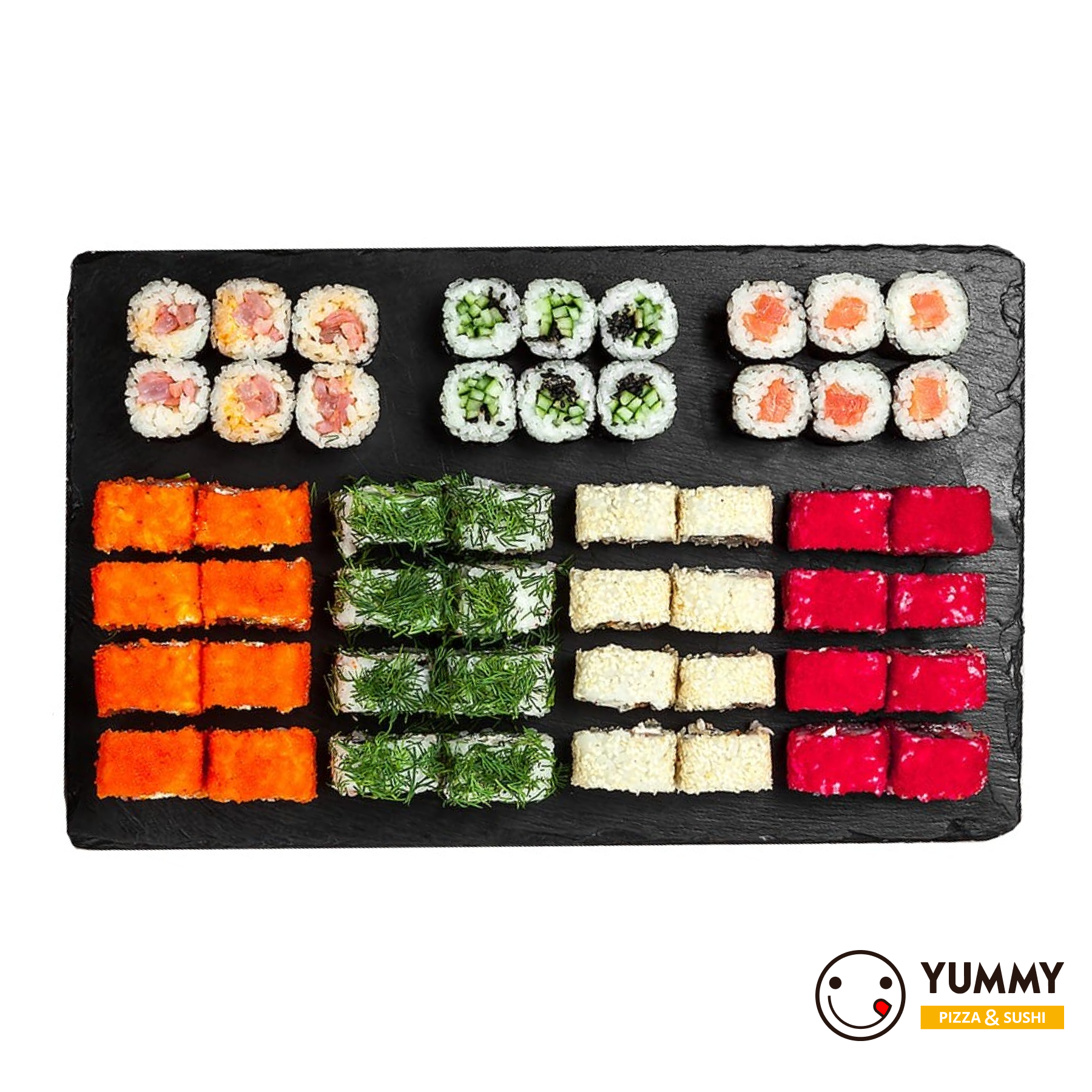 Ролл «Фирменный», ролл «Сёгун», ролл «Филадельфия Грин», ролл «Калифорния», Маки с креветкой спайси, Маки с лососем, Маки с огурцом (56 шт)